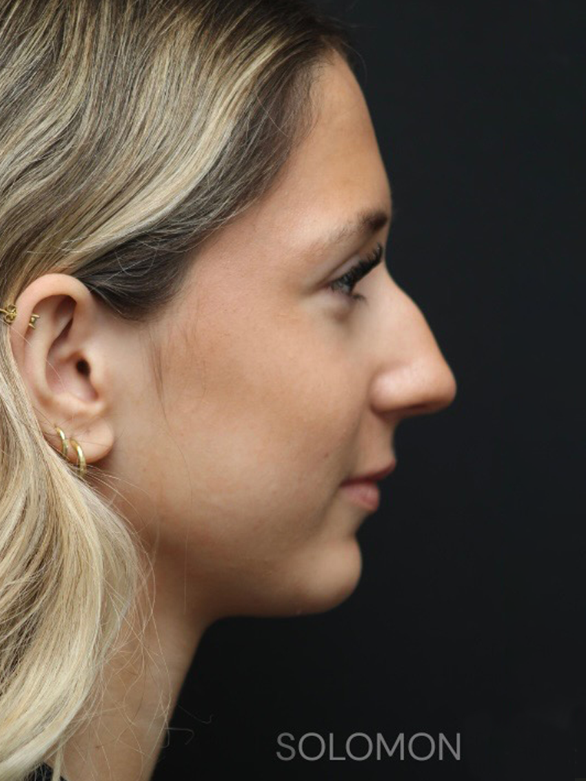 Before and After Nasal Tip Plasty with Dr. Philip Solomon of Toronto. This patient is a 23 year old young woman who underwent a closed rhinoplasty to address multiple concerns with her nasal appearance. Her main goals were to address the shape of her nasal tip, the removal of her dorsal bump and drooping nasal tip. The nasal tip was reshaped and modified for a more feminine and triangulated nasal appearance.