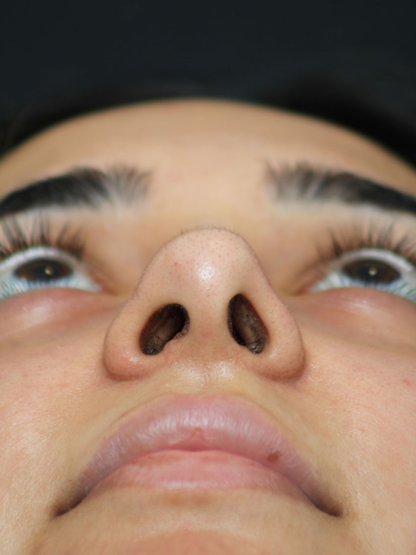 Suture tip plasty with addition of cartilage grafts to her nasal tip sidewall provided a natural yet structurally sound nasal tip. Her nasal tip required not only refinement but addition of stabilizing cartilage grafts to ensure she didnt develop breathing problems. Her basal or bottom view of her nasal tip demonstrates the changes in her nasal tip structure.