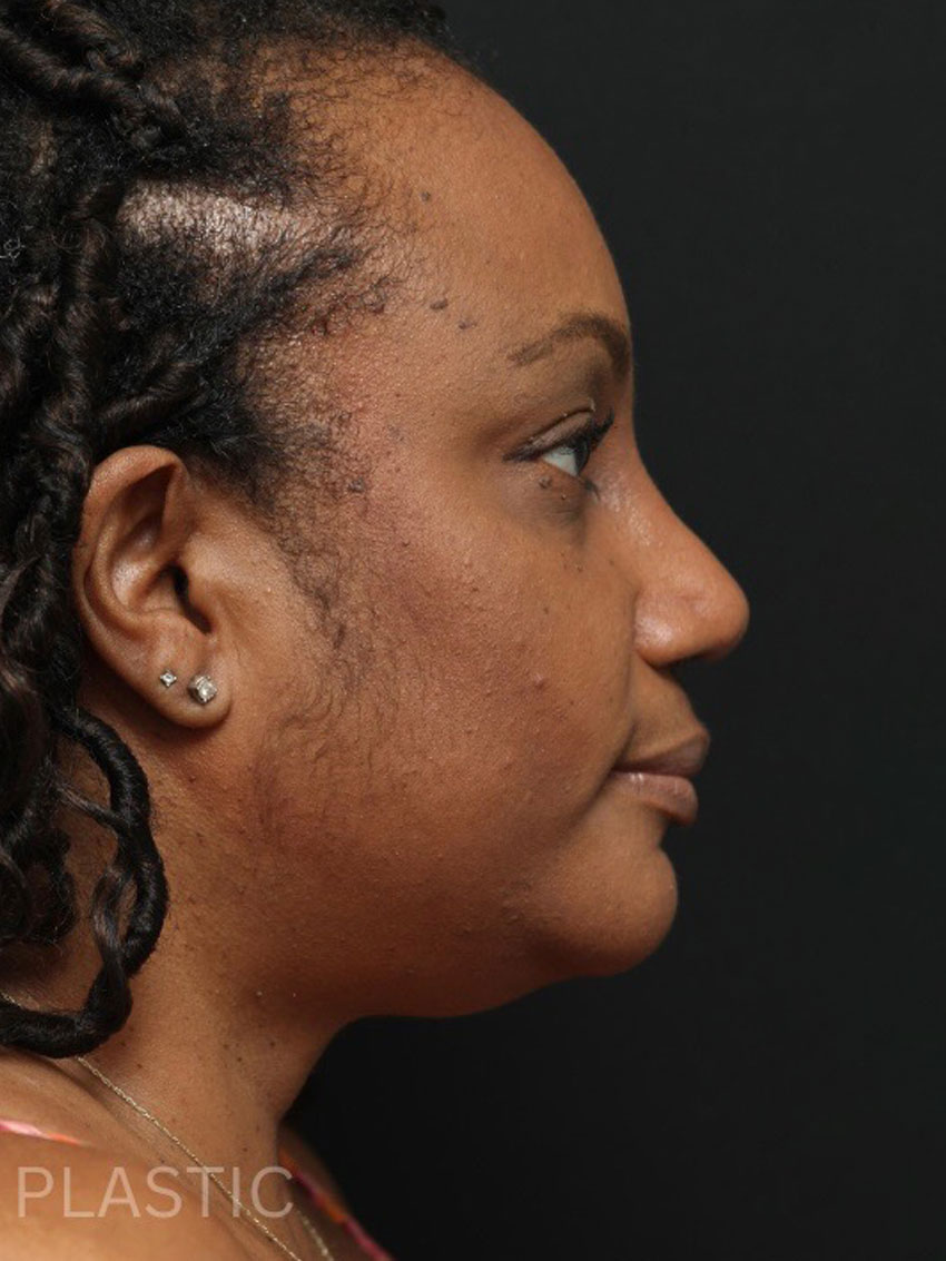 Attractive African American female sought rhinoplasty surgery. Her goal was to raise her nasal bridge and narrow her nasal tip. Her results are representative of rhinoplasty procedure that are performed to improve nasal proportions in an african american female.